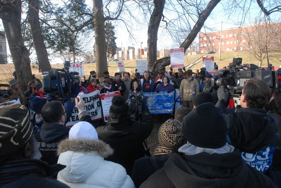 Several hundred joined a rally outside Central High School where Gov. Corbett failed to show up, alarmed by protests. (Photo: Joseph Marchetti)