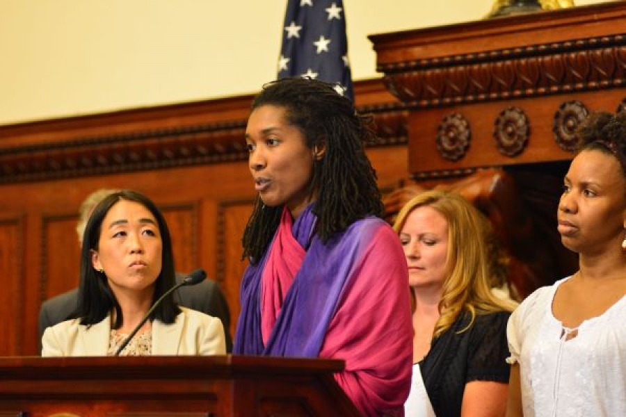 Parent Tonayia Coffer speaks at a September City Hall press conference on the school complaints process. Behind her stands parents Helen Gym, Kimberly Moore, and Tomika Anglin. Parents United partnered with elected officials City Councilman Bill Green and Councilwoman Maria Quinones Sanchez, who loaned their support to the complaints effort.