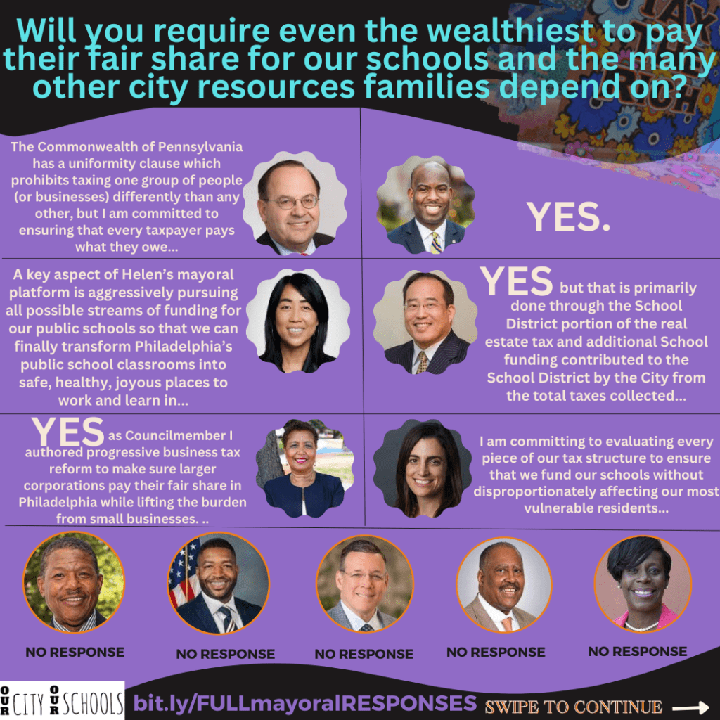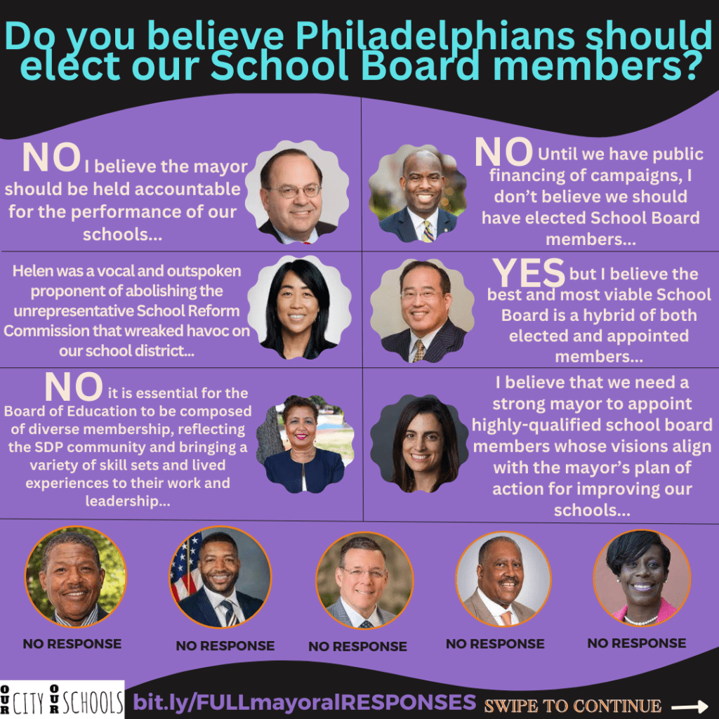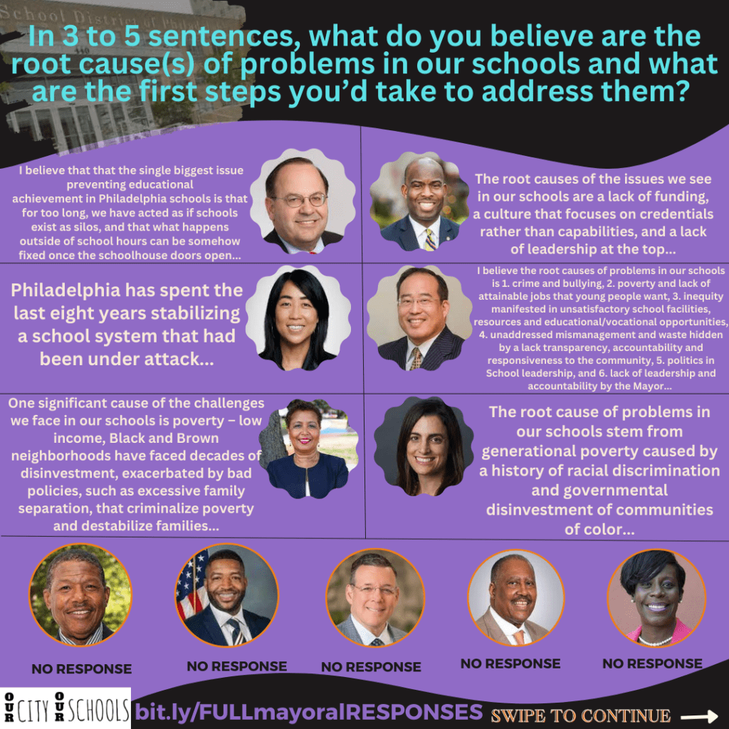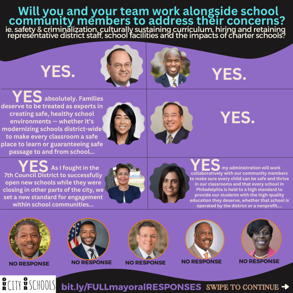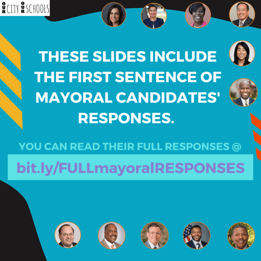 Throughout March, the Our City Our Schools coalition shared five prompts with each of the Mayoral candidates to learn more about their plans for transforming our schools. We are a coalition of organizations and individuals that demand fairly funded transformative schools that address the needs and desires of school community members. These questions speak to core values of how our schools are being led, shaped and serving our communities. We have included the first sentence of responses from each of the mayoral candidates. you can see their full responses @ bit.ly/FULLmayoralRESPONSES